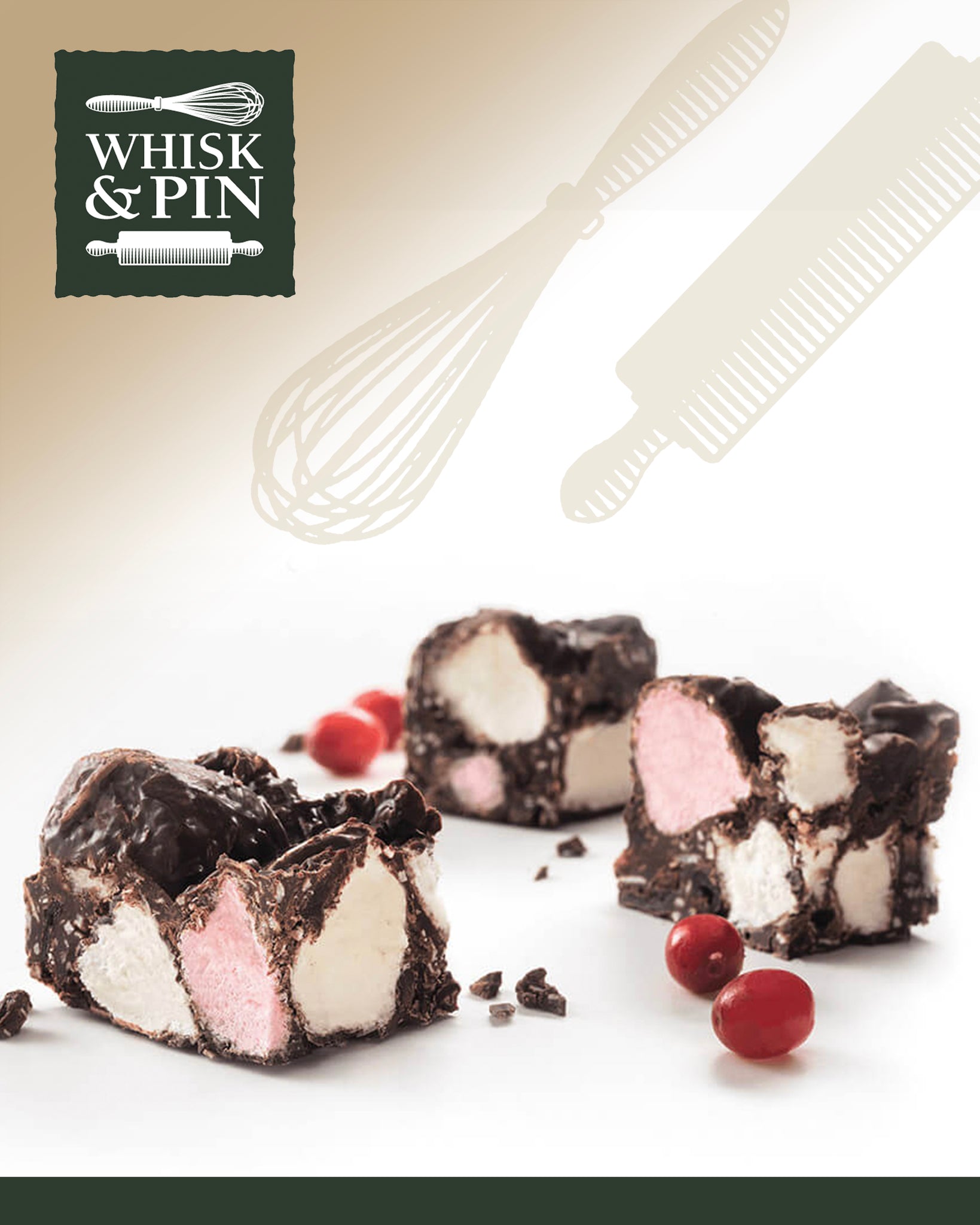 This delicious Rocky Road Chocolate Bar is HANDCRAFTED with dark Belgian chocolate, luscious cranberries and coconut.